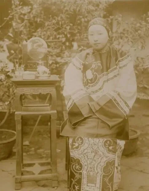 这位妇女身穿细纹繁复的传统大褂,袍下是绣花的裙子,三寸金莲踩在凳子边,旁边放着只老式台钟,奶奶说,咱们乡下其实很少有人能这样打扮,只有年节或见客时才穿一回,这身衣服做工实在,晚清老照片里出现的妇人打扮,有时候比皇宫里的还讲究点。