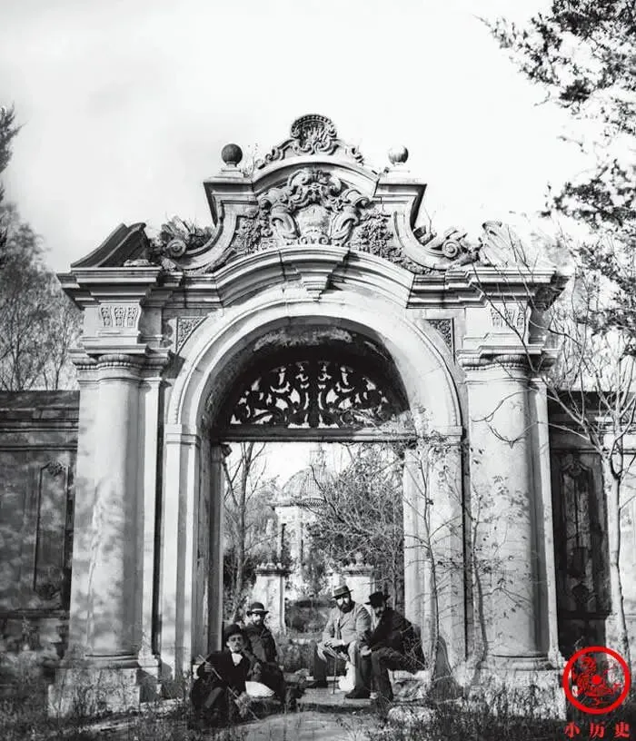 再往里看,这道残破的圆拱门,花纹还在却补满裂痕,门洞底下坐着几个穿西装的洋人,衣领翻着,表情松弛,跟郊游似的,大概没谁能想到,拍照片那会儿,这里两代人都还在收拾废墟,后头远远一串小房影,地上是没人打理的碎屑和细枝,奶奶说当年谁敢在皇家园子里乱坐,早让差役赶出去了,那阵规矩也都跟烟一样散了。