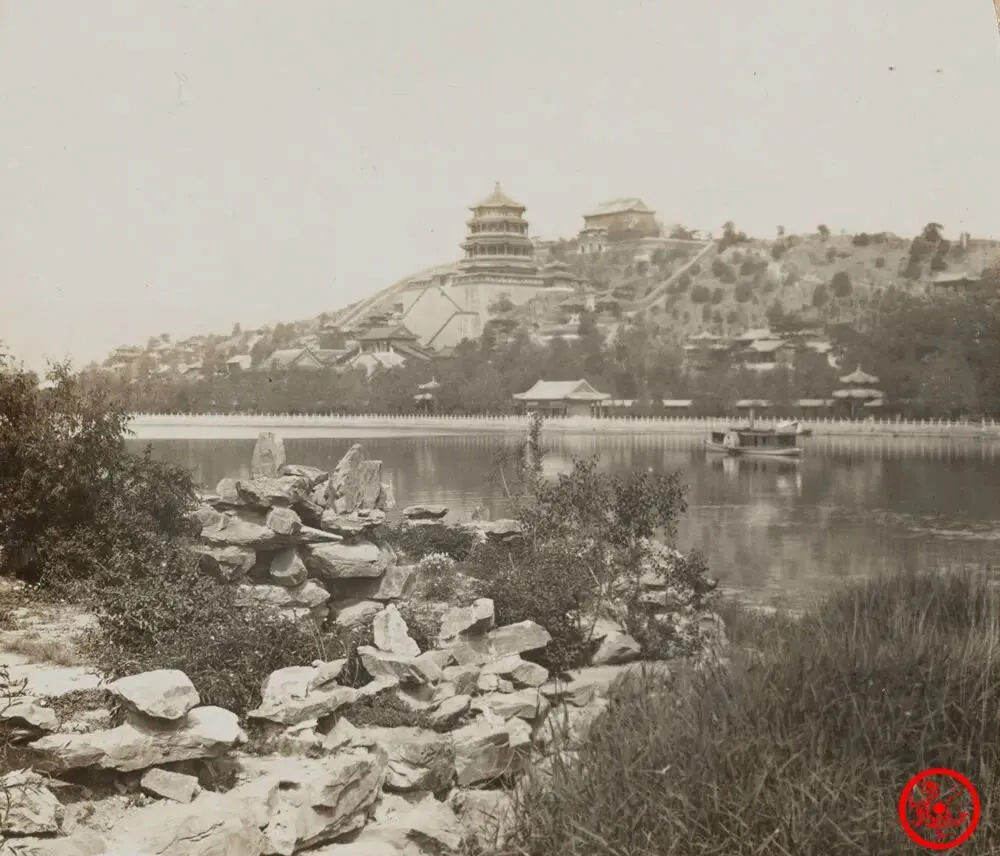 这张照片里,近处是假山和湖水,中远处那一座高高的塔楼就是万寿山上的佛香阁,沿着湖边走,环廊慢慢套上一圈,远山淡淡铺在背景,水面还漂着一只来往的画舫,那时的昆明湖没有现在这么热闹,岸边杂草比人还高,石头垒成的小丘,也许某个小太监站在那里望了很久。