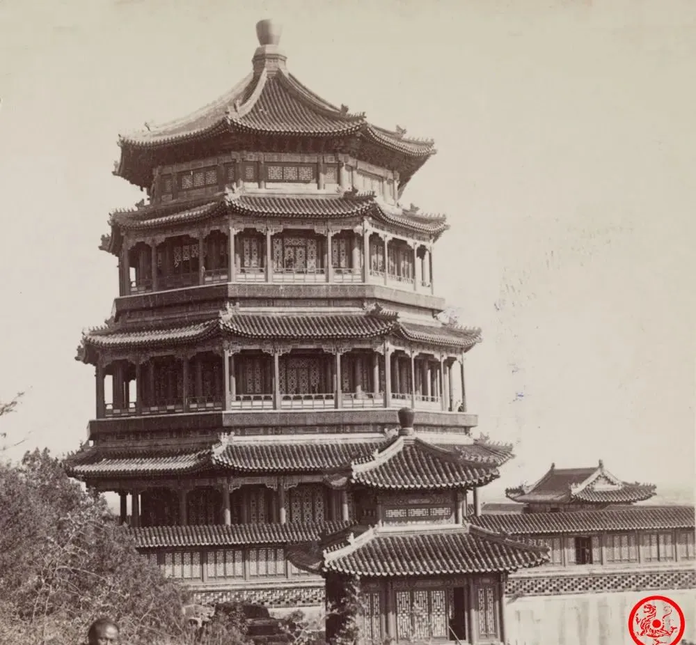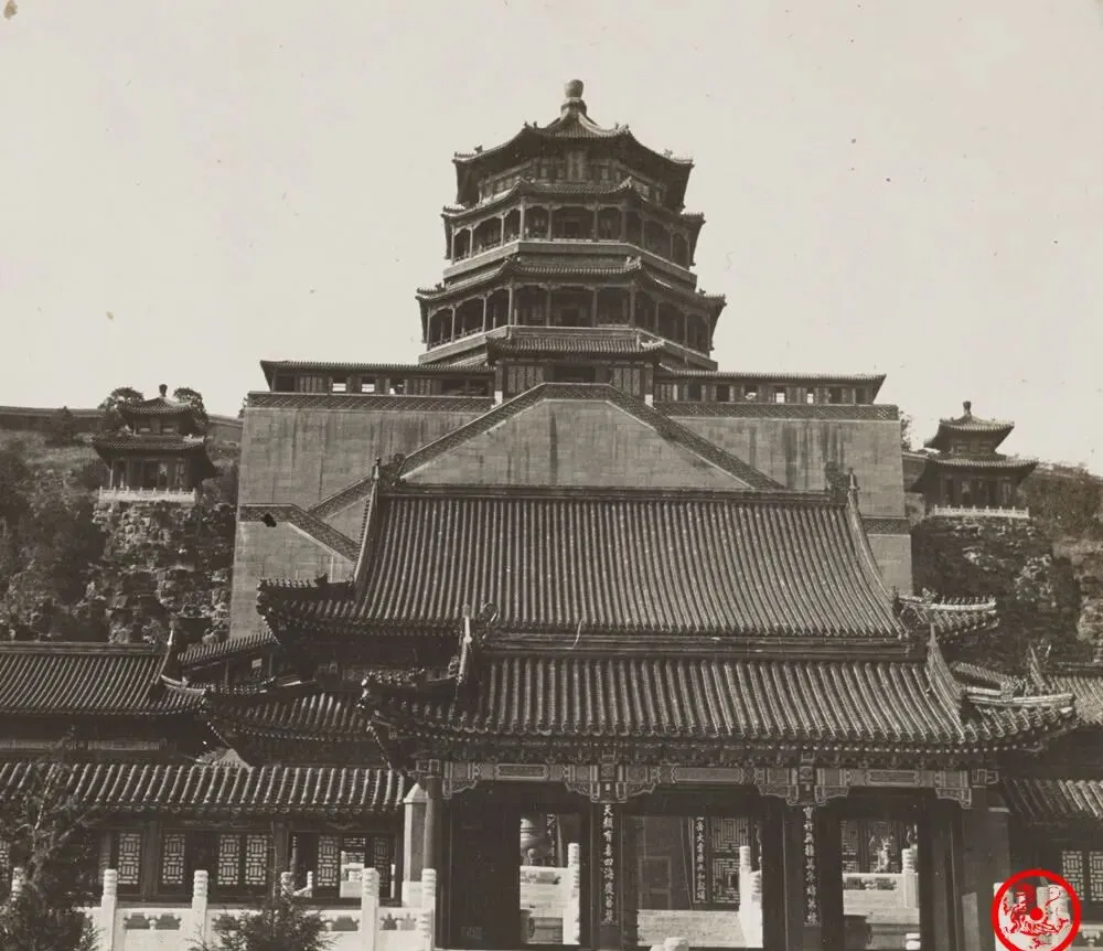 图中这另一个角度能看出佛香阁的层层叠叠,每一层瓦片都亮着光泽,转角攒尖,全是大手笔,老照片里还能猜到那个年代修起来得有多少手艺人累得直不起腰来,哪像现在钢筋水泥三天两头竖个高楼。