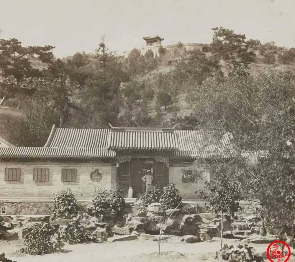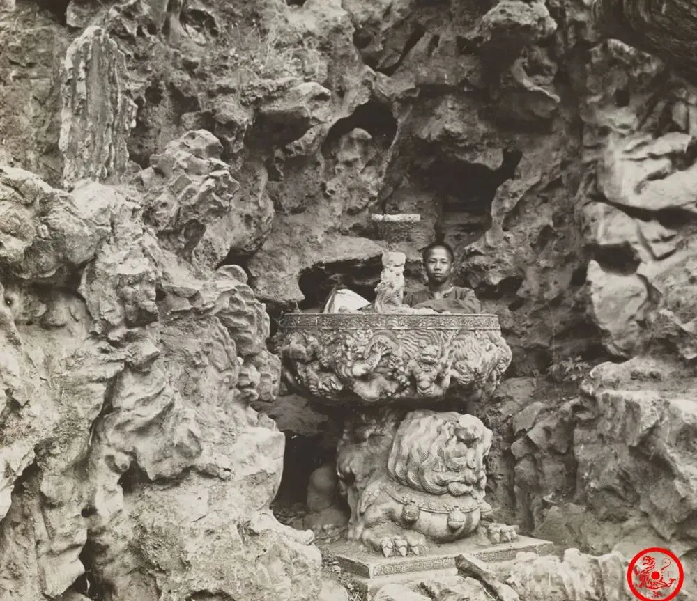 这张照片里的主角不是楼,是假山中间那个半藏着的人影,有说是太监,有说是守院的杂役,石头假山里,摆放一尊狮子足的大缸,满身浮雕,细看的时候很容易错过那个人的眼神,哪怕是被战乱退散以后的人,也得在园子里值守,往日皇家的威仪到了那时候,全落在一块块石头和一双双眼睛上。
