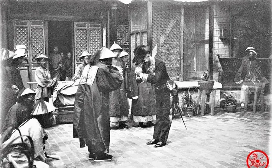 这个场面叫作揖,西装那位是法国来的外交使节,穿长袍戴顶帽子的本地官吏正对着他作揖,手交握在胸,身子弯两弯,院子里静得只听见几个人气息喘动,后面站着的还有一圈打杂的小吏,各自神情也不全一样,这一幕挪到现在真有点戏台上的味道。