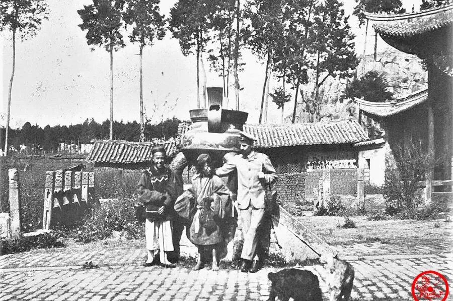 小时候村口也常有条守门狗,跟前跟后,鞋都踩脏,谁家捏了肉骨头出来就能叫回去,照片上那两位看衣服样式像是北方人,站姿都有点发憷,拍照的洋人胳膊搭肩带着笑,狗见镜头比人还自在,这画面挺有意思。