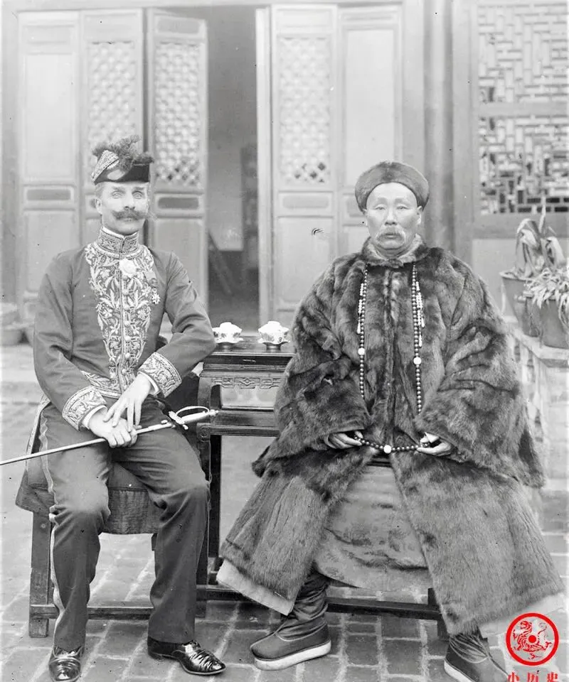 遇上外宾合照算稀罕事,那个年月,能坐到一起摆拍就不是一般人,听爷爷讲,官衣上的顶珠和朝珠一长串一长串,光数珠子小孩都能玩半天,那时候讲究穿戴,讲究排场,现在两人合影怎么也照不出那份讲究劲。