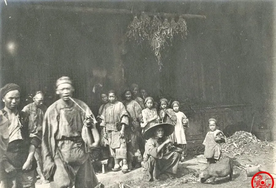 这帮人围在一起,一半孩子一半大人,衣服上泥灰多,旁边辣椒串倒是最鲜亮的一团,前边有个小孩拎着一头毛猪,也没人管,谁站谁蹲队列也散,没人拍照专门摆造型,大伙都盯着镜头瞅,神态里没什么怕生,反倒有点稚气。