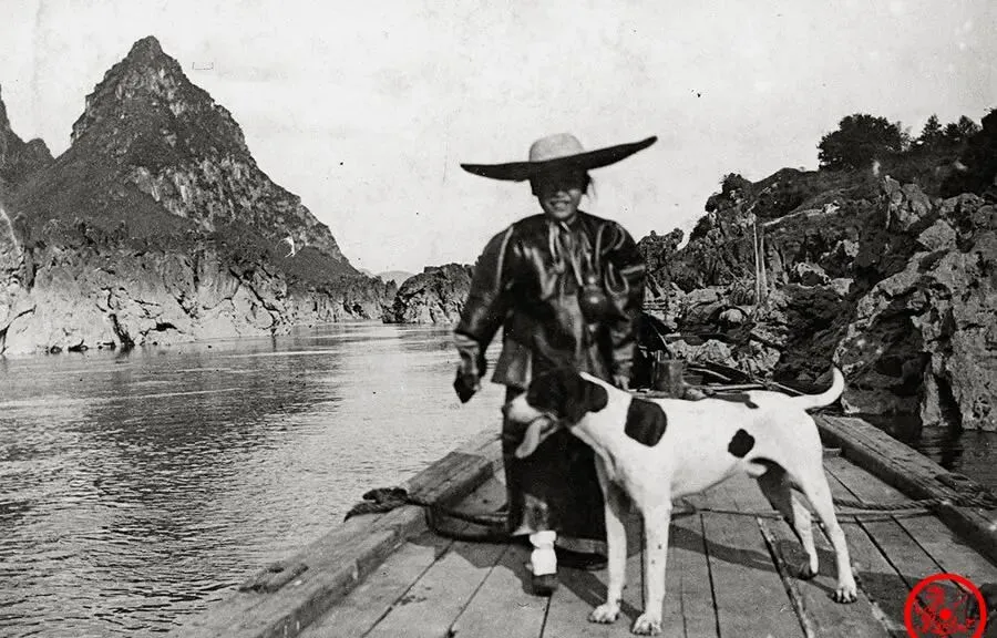 图里的女人顶着斗笠,站船头,一只大狗紧挨着她,江水波光里,两座大山镇着视线,狗的腿站得笔直,女人的神情叫坦然,瞧得出来比船底还结实,谁家水上讨生活的都是半辈子风浪练出来,狗跟在身边,就是一份安心。