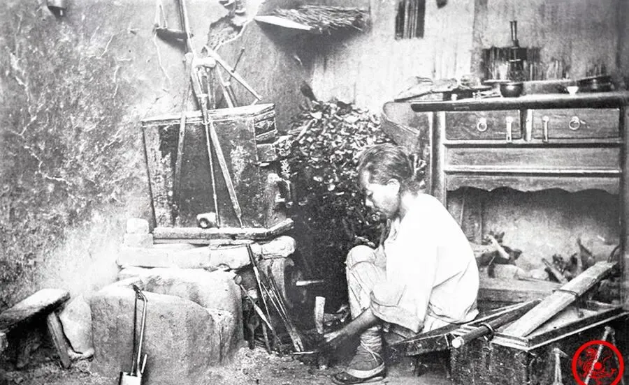铁匠坐在炉灶旁,手上一把钳子攥住铁条,炉火咕嘟咕嘟地喘着气,地上散乱着刚打出来的镰刀、锄头,屋角边放着旧木箱,旁边小灶台上油渍斑斑,这地方好几天不收拾全是铁屑。
