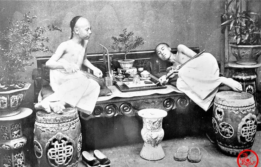 这个场景老一辈提起来只叹气,石制的长榻上,两个人枕着臂膀,一只手搭烟枪,一只手扶碟子,桌子上瓶瓶罐罐,烟枪头上热气悠悠,屋里怕有半天没透气了。