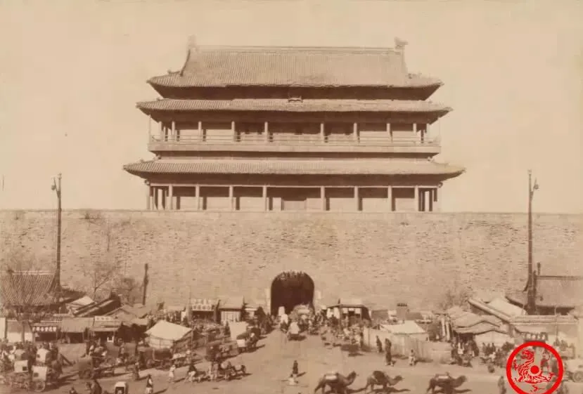 图里这座高大的东西叫前门城楼,老百姓管它叫正阳门,清朝年间,这里是京城真正的门面,三层檐顶,琉璃瓦还算齐整,城墙下面小摊伞棚挤成一片,车夫推着黄包车,赶集的、做小生意的、有打扮体面的也有穿破袄的,门洞口人流没停过,我爸小时候说,谁家有个大点事——走亲戚、看热闹,都爱站这底下转一圈,下午太阳落下去的时候,门洞子阴凉,里头还总有卖凉粉冰棍的。