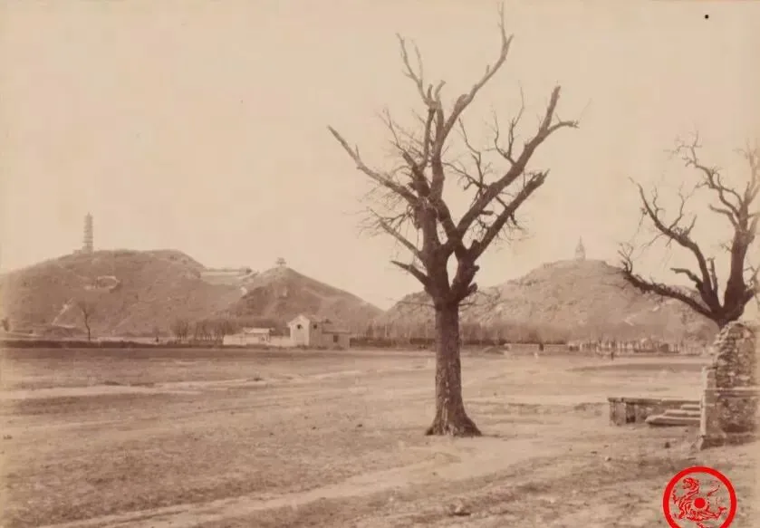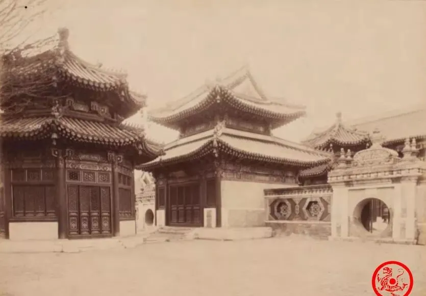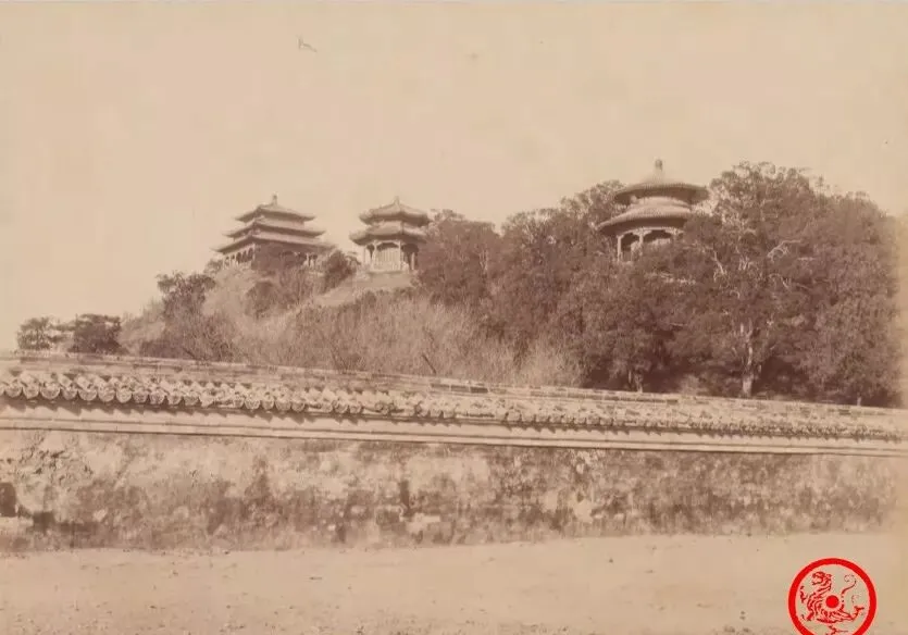 图里这仨重檐的楼,地方老人都叫“景山顶上的三座亭”,是看北京全景的老地方,秋后黄叶落一地,学生放学路过,顺坡滑下来滑泥巴,墙根底下绿琉璃瓦压着,本地人图方便经常翻一下山去后门逛庙会,楼上的视野摊开去能望见很远的紫禁城屋檐,天晴的时候瓷瓦反光,晒得人生疼。