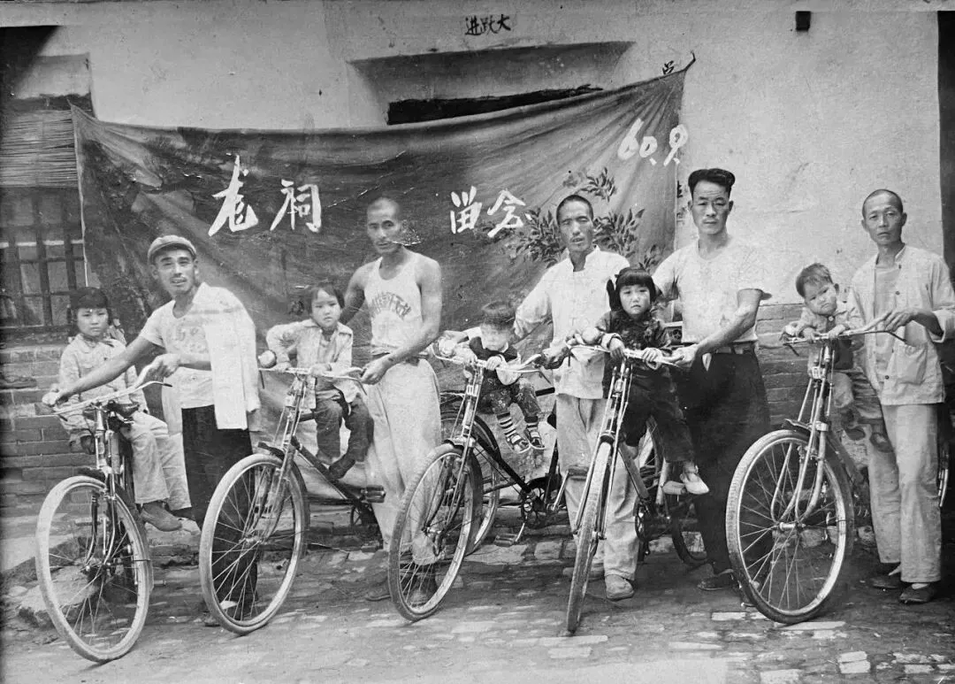 照片上的5个人,每人手推一辆时髦的自行车,每辆车的梁上坐着3—5的孩童。从少儿的衣着穿戴,有两个男孩,三个女童。5辆自行车的品牌也不一样,照片最左边的是一辆轻便自行车,车梁上坐的女孩稍大一点。中间的与最右侧车梁上的孩子衣着似男孩。一字排的5辆自行车有4辆加重自行车。布景挡住了门上的对联,门额上的“大跃进”三个字清晰地留下了时代印迹。从场景判断,这是游走于乡村集市、庙会的流动摄影商拍摄的照片。被摄人物身后的布景是用来拍人像照的。5个人,5辆车,一字排开,显得布景小了许多。