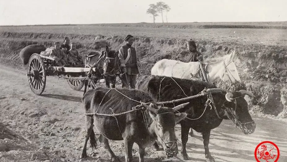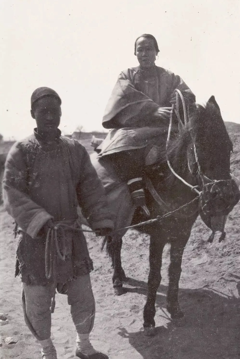 图中坐在骡背上的,是位穿着厚实长袍的妇女,神色镇定,身下的小骡子不紧不慢地走着,前头一名男子领着缰绳,裤腿磨得脱线,袖口打着补丁,站在地面略弓着身,怎么看都透着个“跟随”的劲头,这种搭配在那年头常见,女主家有点底子才能这么摆阵仗,左一筐右一袋,走街串巷,不怕路远。