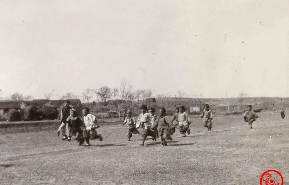 空地上孩子们撒着腿跑得飞快,鞋底踢起尘土,短褂衣袖全给风吹成鼓包,后面有个小伙跟着,也不知是喊回家还是催着干活,这种场景只要天一晴,孩子们就冲出去疯,追着喊、笑闹,身影斜斜跳进秋天的光里。
