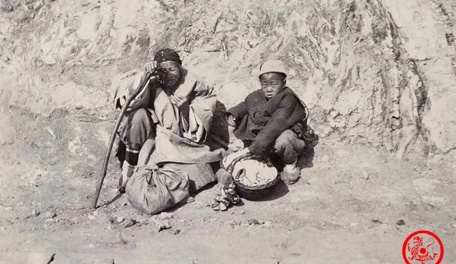 山路边上歇着的母子,母亲手里拄着掉皮枴杖,竹篮里装着破包和干粮,孩子圆脸贴着膝盖,眼睛望着前面路,风把头发吹起一缕,小篮只有一星半点吃食,这种赶路一天就是为着填饱肚子,遇上歇脚的地儿就要缓口气,走老路其实靠的不止是脚,还有劲头。
