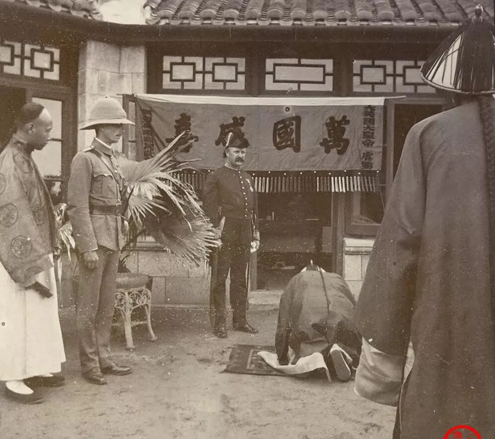 这一幕许多人难想,画面里官服大袖的清国官员跪着,前头两名英军军服笔挺,锦旗上大字写着“万国咸喜”,场面热闹又有点尴尬,跪地三叩首,把锦旗郑重送出去,骨气和权面全写在地上,旁边人全都看着,气氛很微妙。