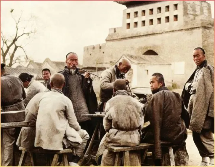 看这张照片,是不是感觉特别.接.地.气?几个老爷们围坐在.露天茶.摊前,抽着旱烟.袋,聊着家长里短。背后就是北京城的城墙,.这.场景现在可是再.也见不到了。那时候没有手机,没有网络,.人与人.之间.的交流就是这么朴实无华。一.壶.茶,几句闲话,就能消磨大半天,这份从容淡定.,现代人是真的学不来了。
