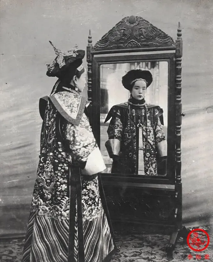 图里这块镜子和身上的蟒袍,搁今天看着也珍贵,女主人站在镜前,一个正面一个背影,都挤在画面里,石榴红的绣纹,金丝边儿盘得圈圈绕,手袖下摆沉甸甸,头上花翎斜着,亮只大,出门一拉风,小时候听姑奶奶讲过,宫里和旗人贵妇打扮得比过年还仔细,衣服压得箱底都不愿多穿几回,镜子前一站,怎么看都带着股威严里的讲究,女眷们扎堆叽叽喳喳商量发型,婆婆还得最后把关,说哪个地方再别针多加俩再顺顺。