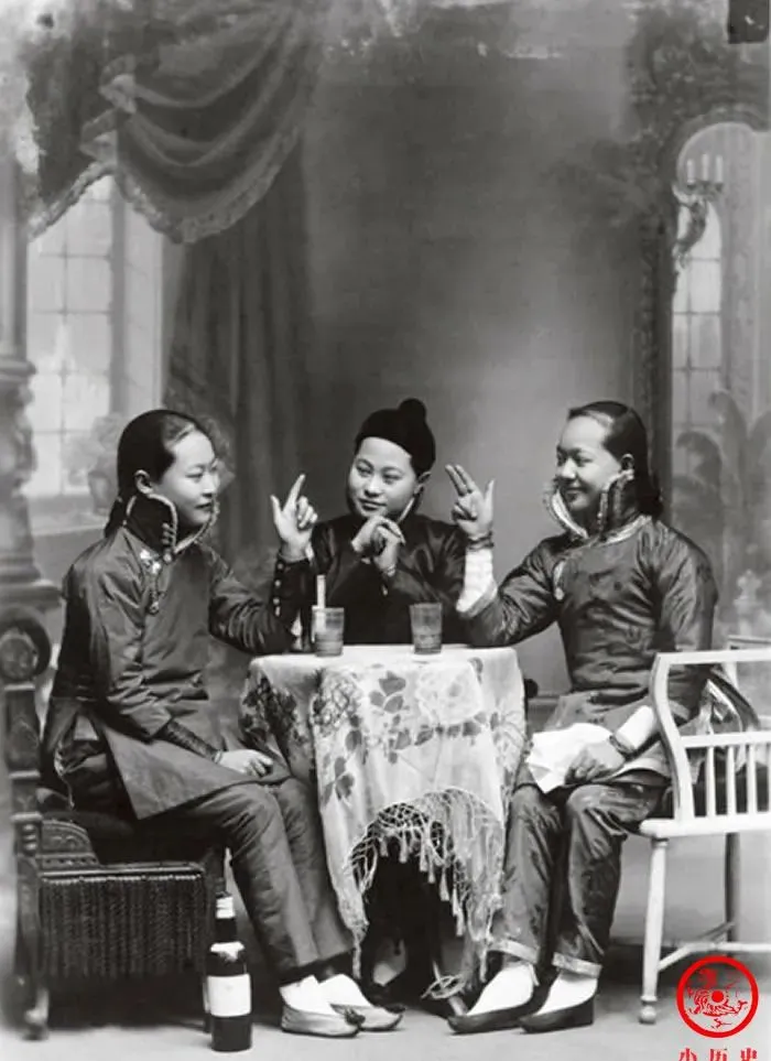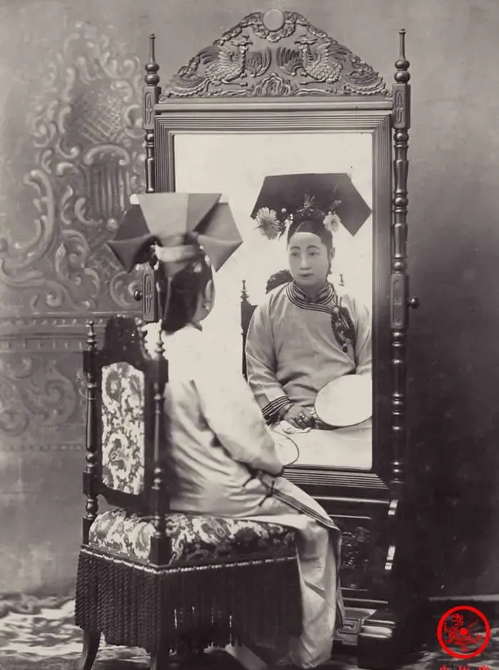 以前人照相是大事,邻居们都要提前炸出一锅花生瓜子烤着,拍摄那天家里小孩都不能乱跑,对着镜子照,代表身份气派,回头看,照片里这些排场不多见,旧社会女人要想站在镜子前留影,还得讲究身世门第。