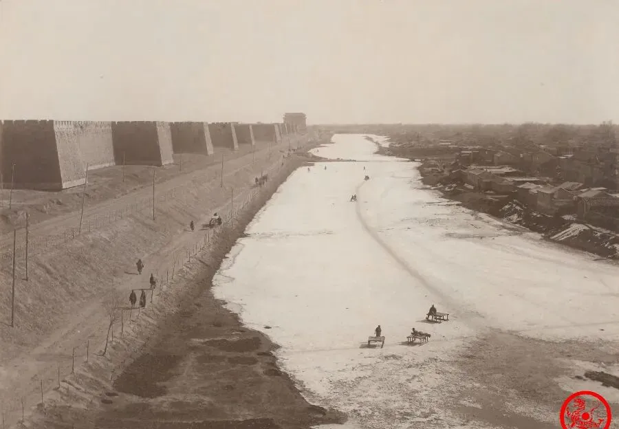 这张显眼,一整道老城墙横着往东绵延,墙下是一条小路,紧挨着的就是冰封的护城河,冬天里结冰最厚,总有人趁天晴滑冰车,小时候我见过老照片里那种自制小冰椅,四根腿,一根棍子推着,咯吱咯吱往前滑护城河这名字,听着威风,其实到了三九天,就是孩子们的乐园,大人有事忙,孩子自有办法玩,照片里远远还能看见几个人坐着划过去,倒也自由比起现在的桥下马路,满眼汽车鸣笛,那阵子河面敞亮,城墙厚重,上一辈人常说,好景总在烟火气里,不是刷漆上色能刷出来的。
