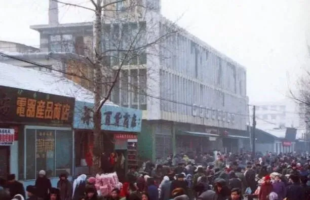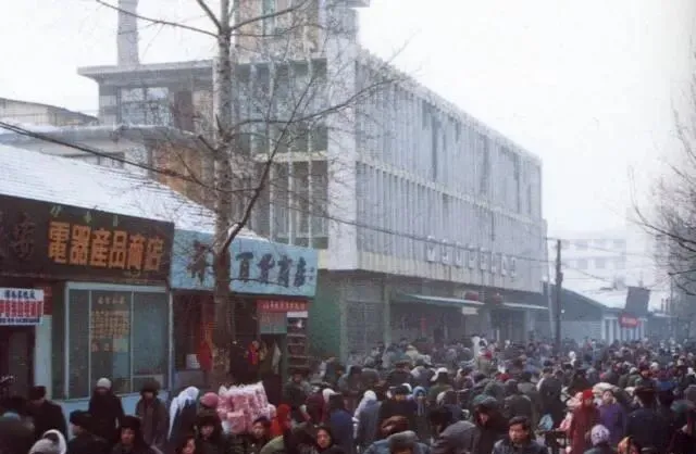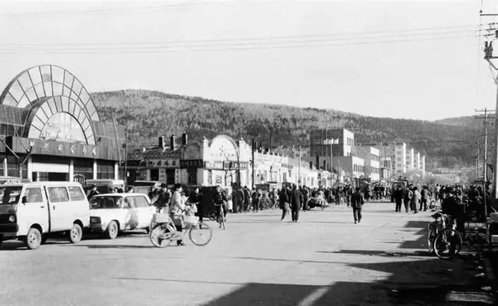 这张是伊春步行街的街景,摊位占了一半马路,另一半全是来凑热闹的,女人推着架子车,小孩拉着棉袄角,男人闲闲站在十字路口聊天,一串自行车从远处摇晃过来,行人掀着门帘走进五交化,路边的招牌油漆已经有些发白,邻居王大妈总说,这条街啊,比啥都旺,买个棉被都得排长队,后来新楼盖起来,小本生意都进楼了,外头轻松多喽。