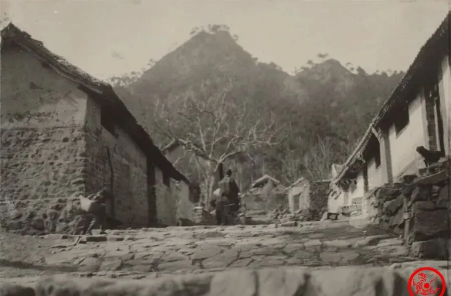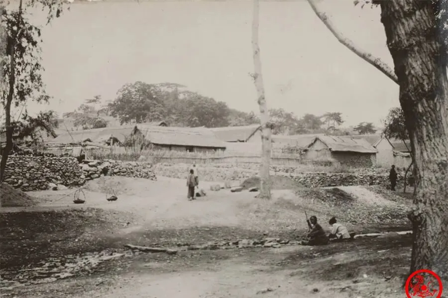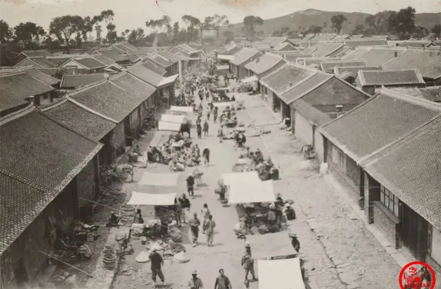 图中这一溜子的街叫三屯营街,窄窄的石板路,两边瓦房,屋檐往下压着,天棚下面是遮阳的摊子,买卖人在这儿坐着,货摊摆得乱中有序,树影落在瓦上,还有远处那个过街楼,不少集市就是这么热闹起来的,满街人影晃悠,谁家刚买了柴,谁挑着担子,一看就知道,那阵日子虽说不宽裕,可每个人都在忙自己的营生。