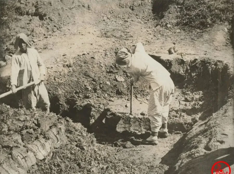 这图里的活叫做打杂肥,两个穿短褂的大汉正埋头折腾地里的泥巴,庄稼地里没啥好化肥,就靠搅和些草、粪、泥,积成一堆,停上些时日让它沤透了,拿来给地灌点营养,这活儿没啥技术,纯力气,小时候跟着大人去地头,泥巴味儿让鼻子一皱,手里那一铲下去,谁还顾得上干净,日子紧巴巴,全指望这点土肥过日子。