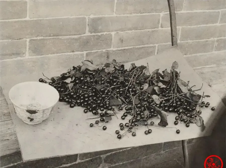 这一堆小樱桃是山里摘回来的,颗粒不大,颜色黑光亮,拌着树叶堆在桌板上,小时候嘴馋,爬上山摘了一把一把的吃,酸酸的带点甜,家里老人说这叫野樱桃,可别贪多,吃多了牙缝发酸,不过嘴里那口果味始终记得,哪比得上后来商场里包装好的那些水果新鲜生动。
