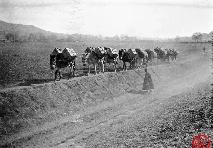 图中这一长串就是运输骡马队,那时候跑大路运东西,比的不是谁车多,是谁的牲口能扛,油料货物摞得高高的一兜一兜,全靠毛驴马驹顶着,脊背上压着厚木箱和毛毡包,一队队往前赶,尘土在后头飘,走一条路就是一天,没人觉得慢,因为路就在天边拖着,赶牲口的大人喊一嗓子,羊皮袄子下毛活打结,春秋来回,干得就是这样的苦活,爷爷说以前这个行当混不上粮,就得靠力气和耐性熬,哪像现在拖拉机一响谁还赶骡马队。