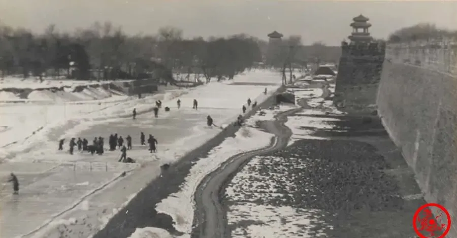 图里这一大片冰面就是北京城老护城河,冬至后北方最冷的时候,人都猫着不愿出门,这会反倒成了采冰的好时机,河面冻得瓷瓷实实,黑压压一群人在上面忙,清早太阳一挂,冰面凉气直窜牙缝,附近院子里的人悄悄推门,远远能听见冰镩砸下去的咔哒声。