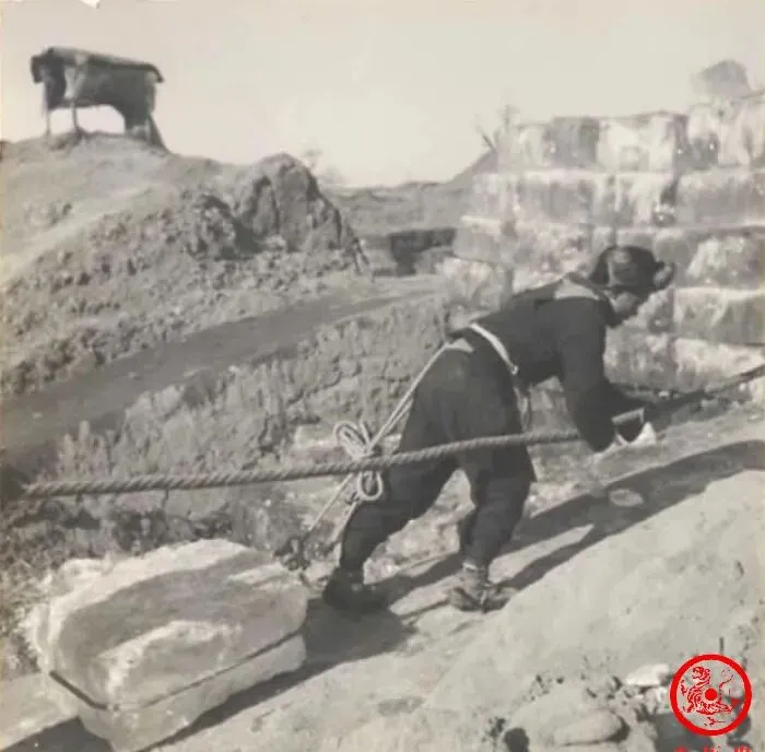 这张照片里能看明白,冰块不是随便搬进冰窖,都是用粗绳套好,腰上一勒,整个人贴着地面,倒着拖到台阶上去,冰块表面都擦掉了一层泥水,工人后背伛偻着,鞋上粘满厚泥,一望上去要多辛苦有多辛苦。