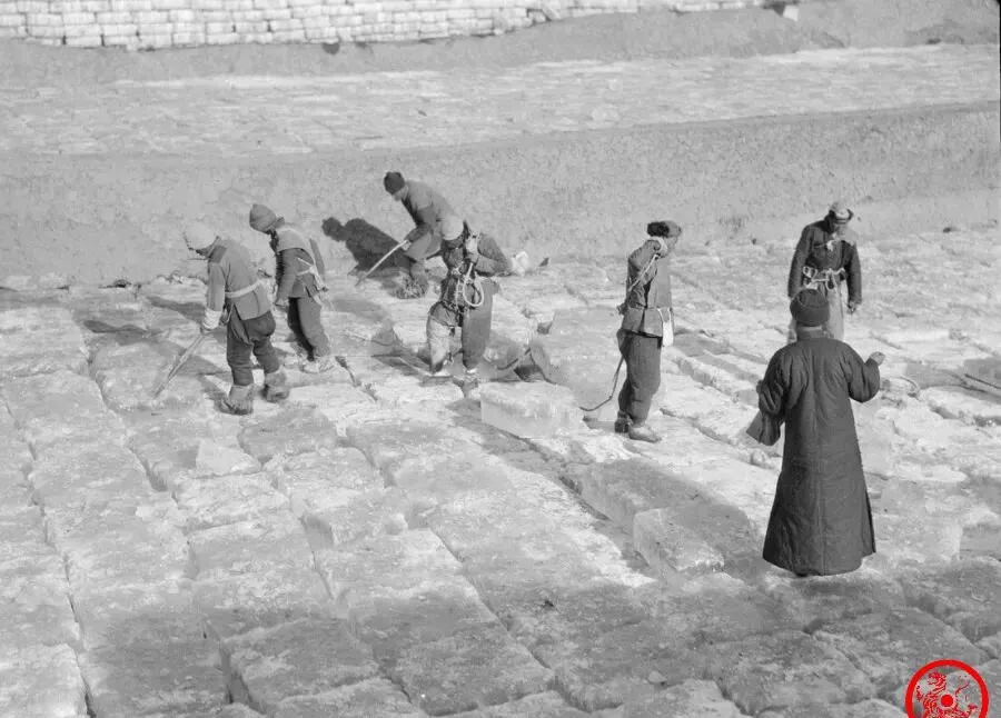 老照片:极寒天重现北京“采冰”,工人分工有序