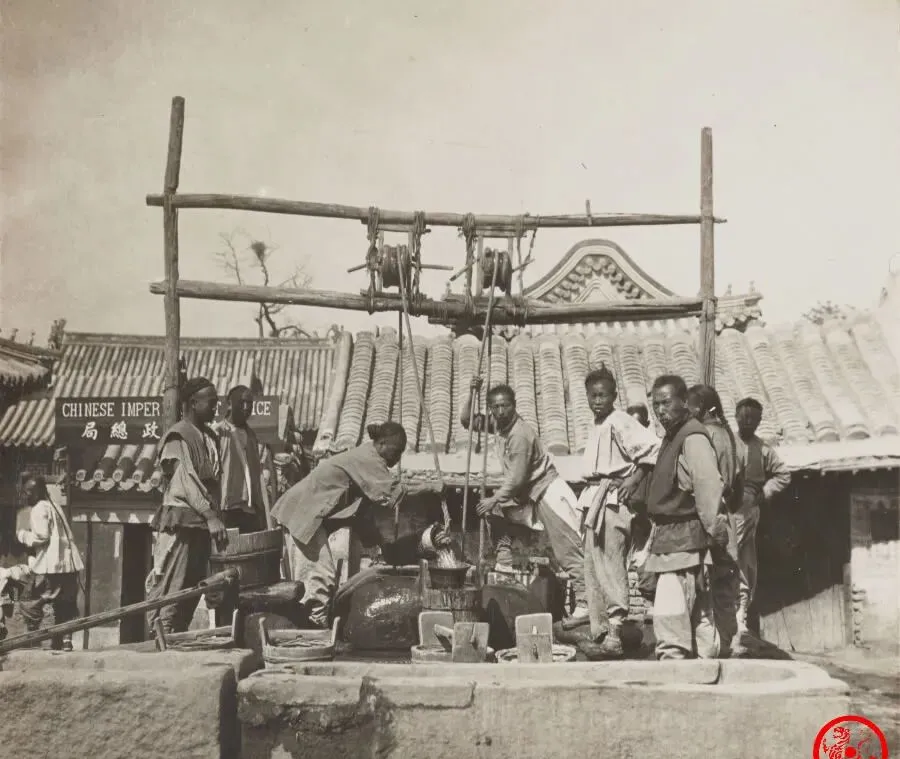 图中这口老井就是那阵子胡同里的大事儿,架上用两根粗木头搭成,挂着吊桶,水桶旁边挤着一圈人,腰间搭着抹布或者扯着空陶瓷壶,轮到谁了往下一放,咕咚一下沉到底,绳索吱呀呀地收起来,底下是明晃晃的井水,时不时还能飘上点树叶