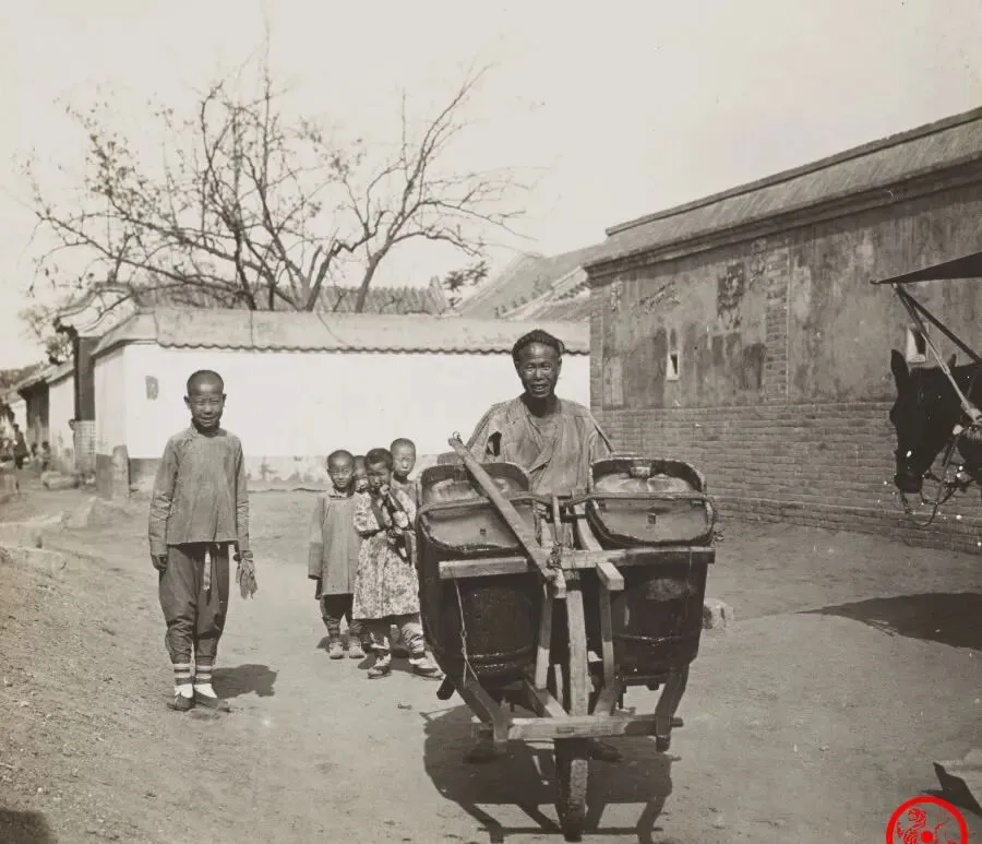 这个扁担独轮车前杠子一看就知道送水的,车上搭着两个大木桶,水夫额角带笑,后头跟着一串小孩凑热闹看稀罕,一路推着嘎吱作响的独轮走巷穿胡同,卖一趟水不容易,手上得有巧劲,遇见颠簸还得用绳子勒稳