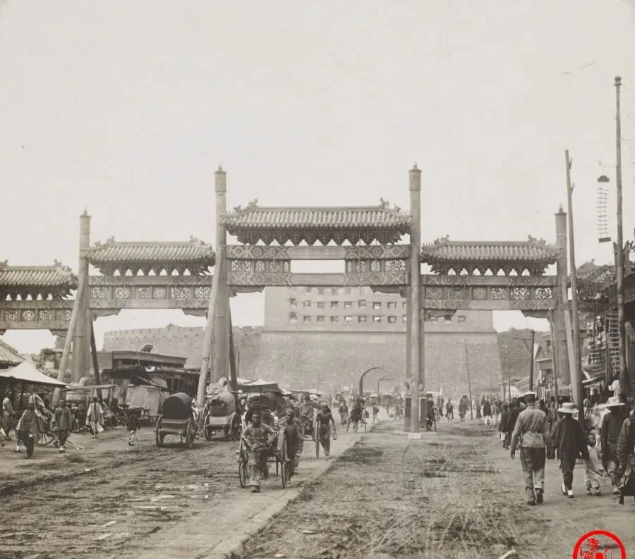 老照片上这牌楼就是前门大街口,街两边闹哄哄,人力车、小贩、货铺都顶着一头灰,远远能看见城楼翘起来的檐角