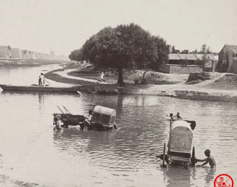 这河面上漂着小船,岸边的车夫两腿泡水抬着车,拉车带货直接闯进水里,岸树下的人光着膀子在推,路边来去安静得很