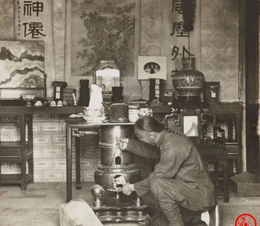 照片里头撑着半间屋子的老式家什,正中一个铜暖壶,炉膛口留着灰,旁边堆着茶杯座钟,大户人家的气派往往体现在这点小物上,烧水的男人蹲在那里添炭,身后挂着字画和大缸,老北京人爱喝茶,能把水烧沸就半天不闲