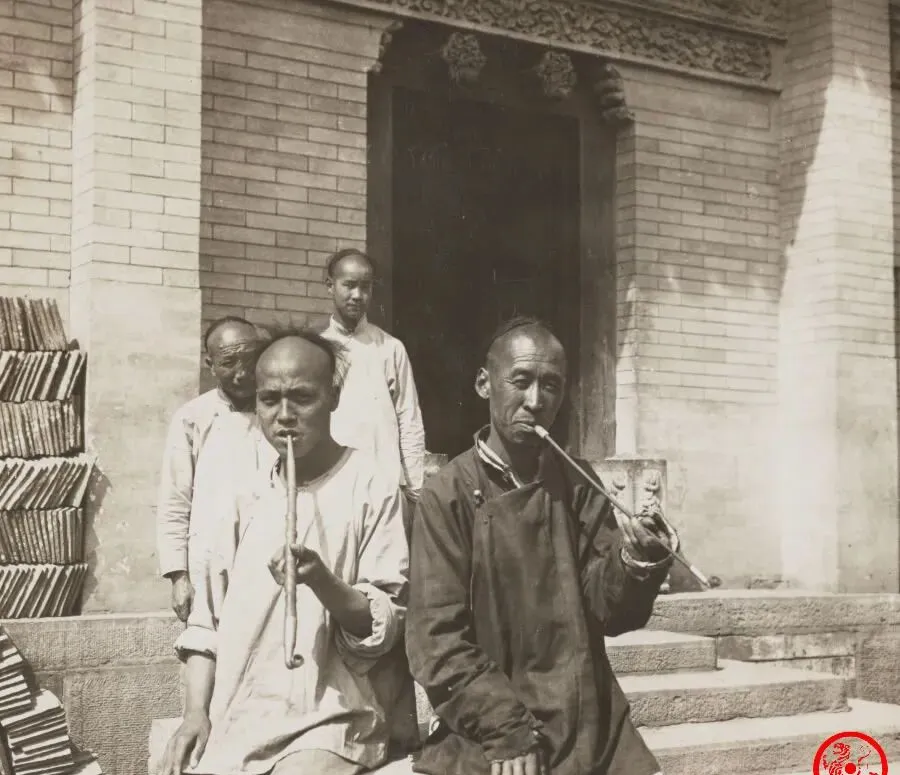 这两个坐台阶上的男人,手里拿着长烟袋,嘴角全是闲着的劲儿,没人着急干活,旁边围着看的人都是邻居,烟丝一撮,打火石一敲,吞云吐雾一口一个悠闲劲儿