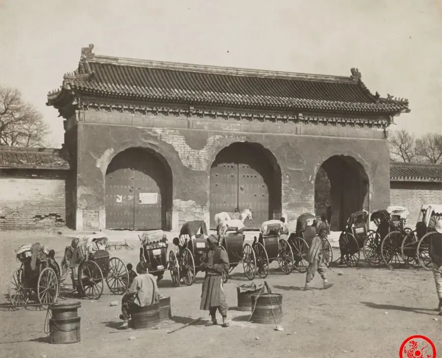 天坛红墙门前蹲了一排人力车,拉车的等生意,旁边地上坐着卖小吃的,阴影下有人合计帐目,小贩拿一兜各色杂货,两边小摊,三五成群,天坛本是祭天的庄重地方,到了清末也闹腾起来