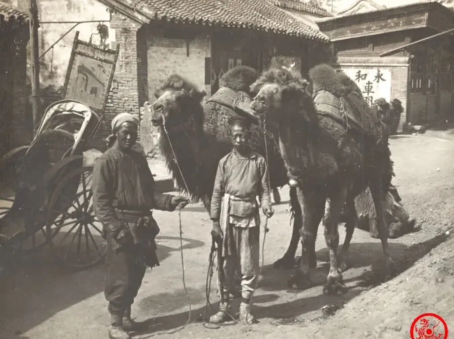 照片里有两峰毛茸茸的骆驼,自带慢慢吞吞的气场,脖子上拴着绳索,篓子里装着货,旁边还有骆驼夫,人站骆驼当中,后面就是主干道和人力车
