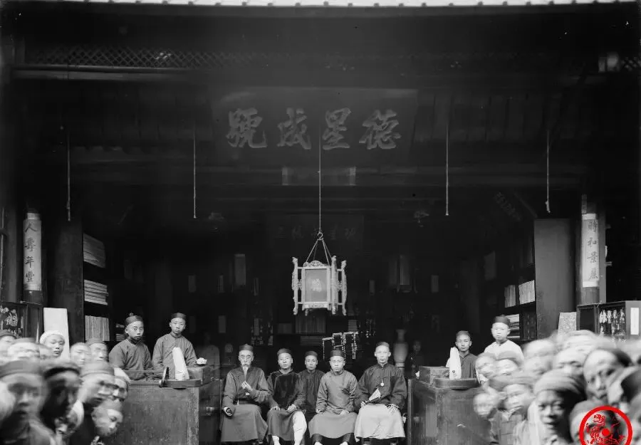 屋檐下这群人守着的,叫德星成号,老嘉定府里的大商家,门口一挂大匾,厅堂里头挤满了伙计、股东,一张大桌聚着大伙规矩地坐,照片最左头那位,穿黑长袍的,就是当时最有名的杨半城,这个外号家里孩子一听就乐,“家产能割一半城”,富得流油,可偏偏乐善好施,修路、盖学校、收养孤儿,逢年过节总见他出面,家里老人补一句,他们能做到的慈善,讲的是“看天吃饭,顺手济人”,也难怪人缘透心凉。