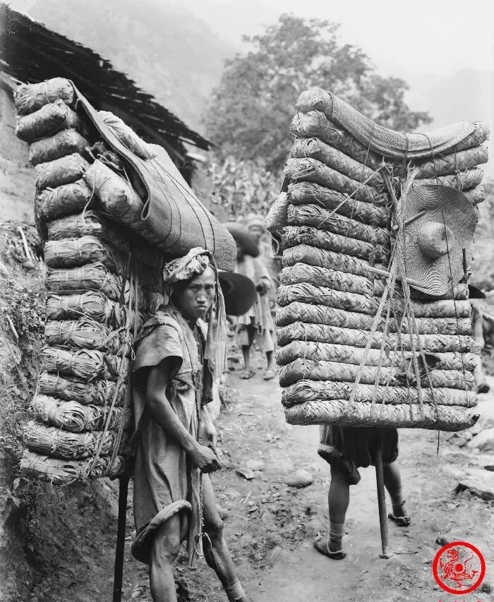 这个场景不用多说,茶马古道上的背夫,无数老照片、书刊封面都抢着用这一张,你仔细看看,每个人都像是背着一堵墙在走,身上的背带勒进肉里,腿肚绷紧成绳,茶包层层叠叠比人还高,一走就是几十里,山路打滑,马都不上,这些人把东西驮进雪域高原,靠的是一口气,问爹娘有谁还记得过去茶运队,谁家多少辈子都和这条路分不开。