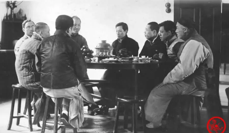 这个场景才是真见生活气,一张圆桌坐上一圈人,衣服是短褂长褂混搭,有的肘子都垫在桌边上,桌中间一口铜火锅兀自冒热气,旁边有一撮盘子摆着,碗杯都不怎么讲花头,气氛松弛,人跟人说话笑起来,角上那位眯着眼,像是刚讲了个冷笑话,坐得最右边的老师一身老棉袄,背后那种旧瓷器台子现在很少见了,“那时候吃饭讲究啥,能围着桌子有锅气就是喜事”,我听老爸念叨过,食堂和家就差一个路口。