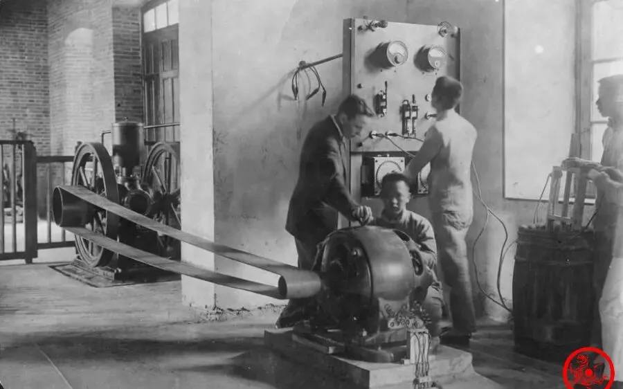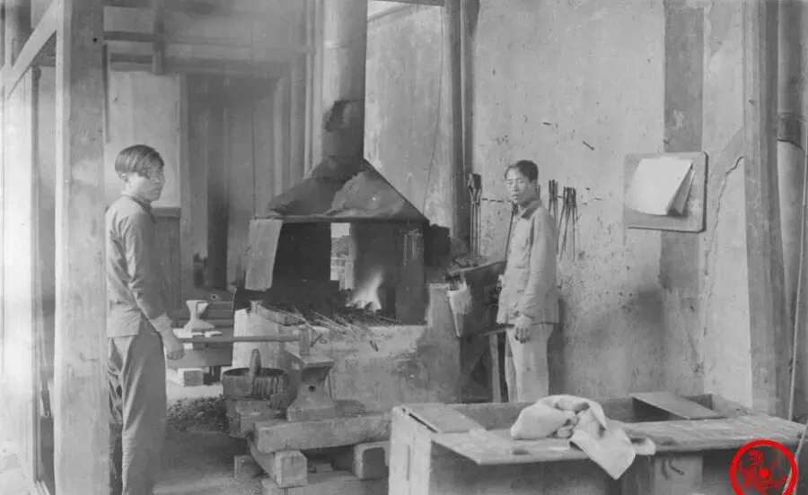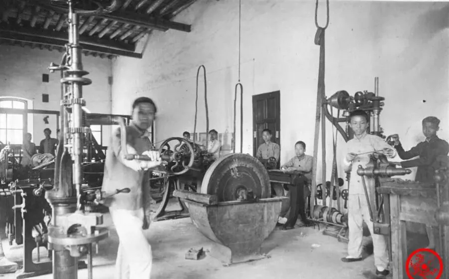 照片里面机械工场比锻铁铺复杂多了,屋里大铁轮、皮带轮、转轴全紧绷着,七八个学生站一圈,都搭着灰衣,靠窗那几个在调车床,屋顶横梁下吊下来粗粗的轴带,前头这人把手搭在设备上,眼神不太有闲,整个场景满是轰轰轰的旧时代响声,谁学成了这套本事,混粮班吃饭怕是没问题,老家有亲戚说过,在机械厂这样练几年出来,啥零件都敢摸,这手艺后来一直传到解放后都吃香。