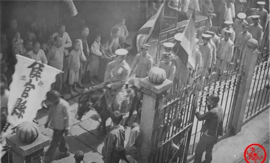 校门口人头攒动,这队伍从门前缓缓走过,旗子举得高,兵丁一律白帽制服,门口老百姓挤在铁栏外看热闹,小孩探着头想追进去,大人一边拉着胳膊一边嚷嚷,闹哄哄里谁都觉得,“兵队走过学校门口,咱这小场面可火了”,成了大事儿也成了回忆。