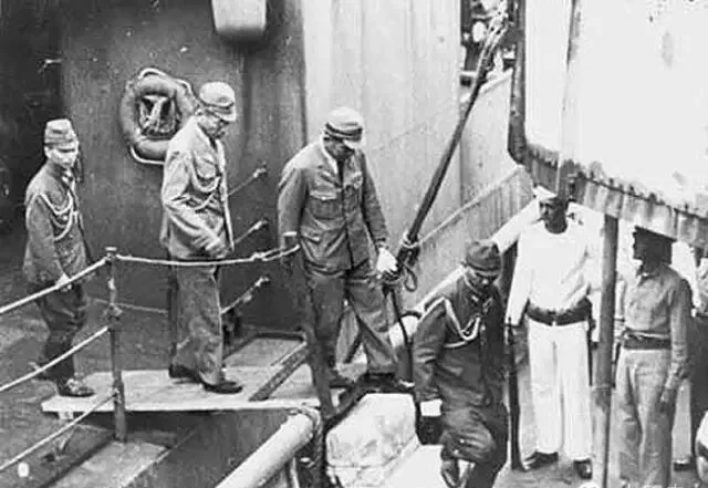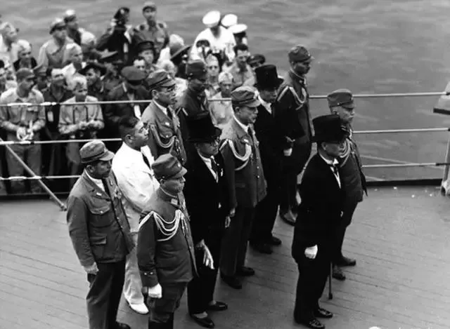 图上就是传说中的日本代表团,穿着军服顶着高帽子,一队一队从舷梯上走出来,背影里全是压力跟失落,重光葵、梅津美治郎带头,谁也不吭气,周围美方水兵早早站定,气氛紧得像拉满了弦,爷爷看照片总说,日本那阵子的背影就没挺得起来过,那天更是灰头土脸,连步子都是沉的。