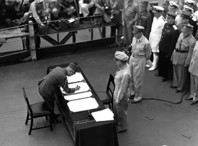 整个投降流程都围着这张桌转,黑色布罩铺得平平展展,文件摞得整整齐齐,盟军各国军官分东西两侧站定,日本代表一个个轮着靠近桌子,递文件递得手心都是汗,桌旁连一丝笑脸都见不到,桌上还有三四支笔,不急不慢地传过来传过去,每个人签名那一笔,等于把那一段历史锤下来,没谁敢乱挥手。