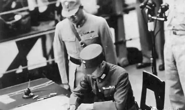 图中正低头签字的,是日本外相重光葵,笔尖在纸面上不慌不忙地画走,麦克阿瑟就站在一边,军帽扣得齐齐整整,冷冷盯着桌面,谁都知道,这一纸签名,比打仗时的手还要重,后头一大排美国军官全站得笔直,历史的分水岭就在这会儿摁下去了。