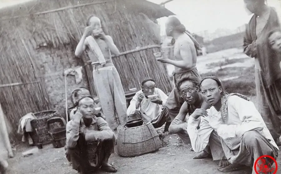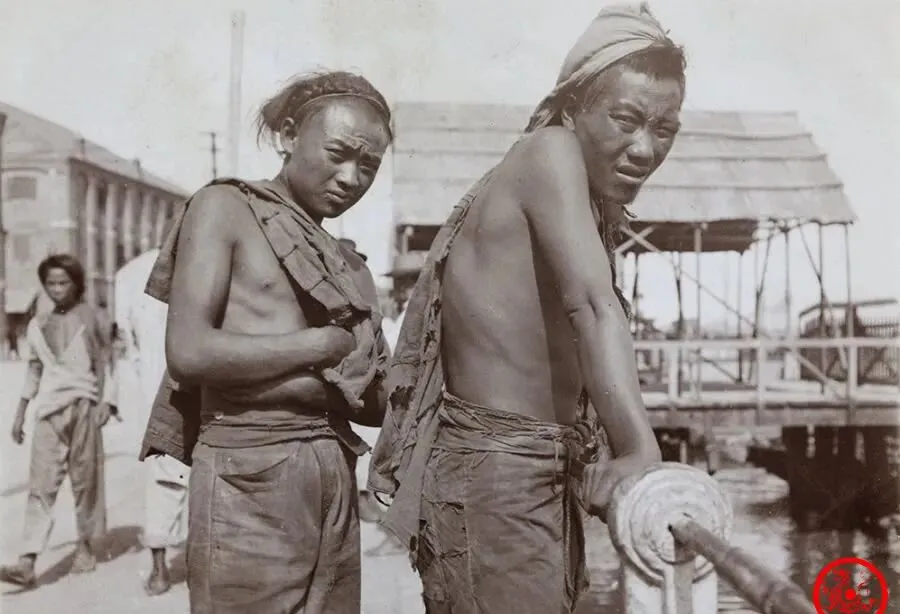 图中这二位,干的是苦力里的硬活儿,码头边的搬卸是一天顶一天的死力气活,身上的短打布衫早就磨出包浆,衣角一片一片地裂开,麻绳勒着腰,汗水顺着发梢滴到脊梁,仔细瞧,男人的辫子都拢在头顶盘着,不像戏里绕脖子那样,一揪一勒地干不成事,真正做活计的人图个利索,哪能让辫子碍事,朝廷那会儿说剪就剪,可老百姓真舍不得扔,怕剪了没好日子,这一点只要是那时候的老北京都认同,时髦归时髦,家门口这个习惯追不上。