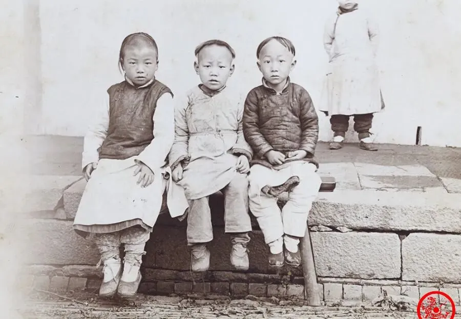 这仨娃坐成一排,仔细看脑门前头都剃掉了,剩下后脑勺的头发还没长够,得留着编辫,今年刚开始不追究剪发了,可哪个大人真敢动手啊,能混到脱辫子的没几个,全是被时代撵得没法哩,听奶奶说起自家兄弟小时候,春天光着脚,秋天顶着寸头,一年头能给洗几次都是讲究,这种光秃秃的脑门,就是那个年月的专属牌子,放现在,可能没几个人舍得这样剃。