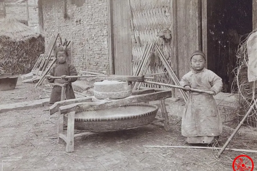 磨盘是石头打的,架在木条上,两小孩绕着圈推着,一趟一趟地走,碾出来的不是白面,是带皮的杂粮,姐姐一边唱着小调,一边抬杆,弟弟喘着气还不敢停,爹妈下地去了,孩子得分担,小时候家里最怕这活,肩膀磨得发红,还得装大人,旁边老太太嘀咕着**“穷人娃娃没得选”**,这种苦,想着其实全村孩子都受过。